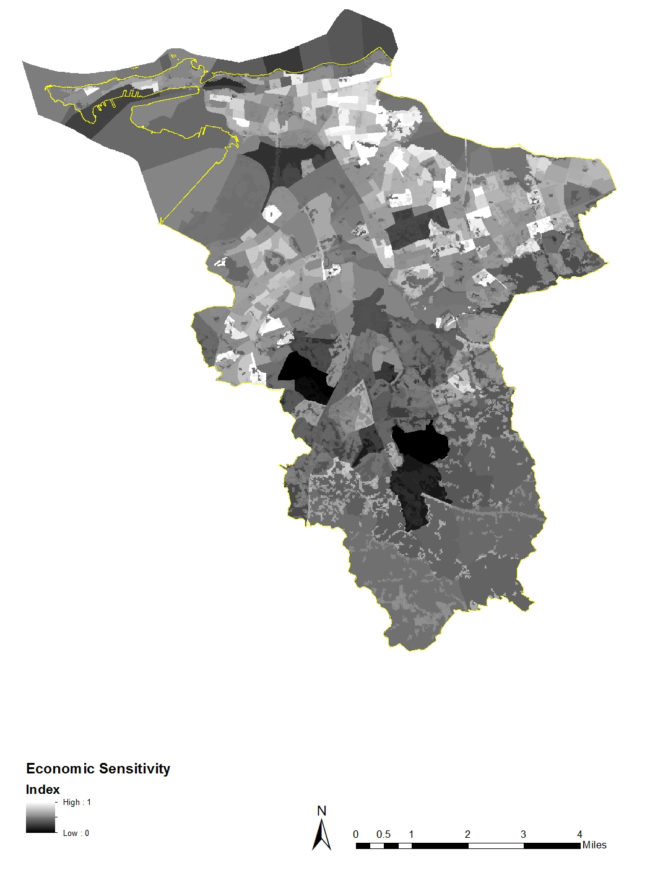 The San Juan Economic Index Map indicates the normalized (between low (0) and high (1)) spatial concentration of the population living in poverty, population unemployed, and households living below the median household income.
