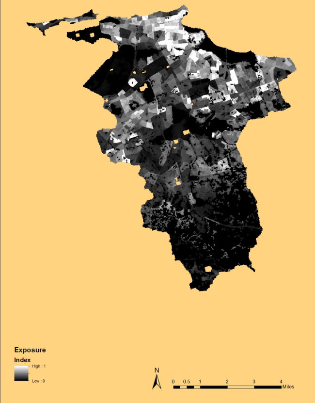 The San Juan Heat Exposure Index Map indicates the normalized (between low (0) and high (1)) spatial concentration (density) of the population most exposed to high surface temperatures.