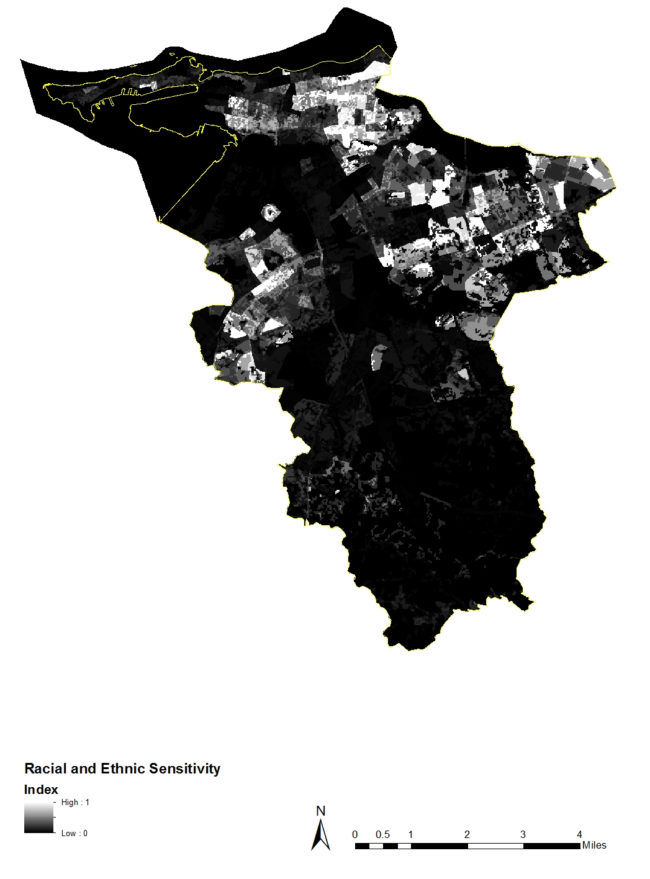 The San Juan Racial/Ethnic Index Map indicates the normalized (between low (0) and high (1)) spatial concentration of the Black or African American population, American Indian and Alaska Native population, and Asian population.