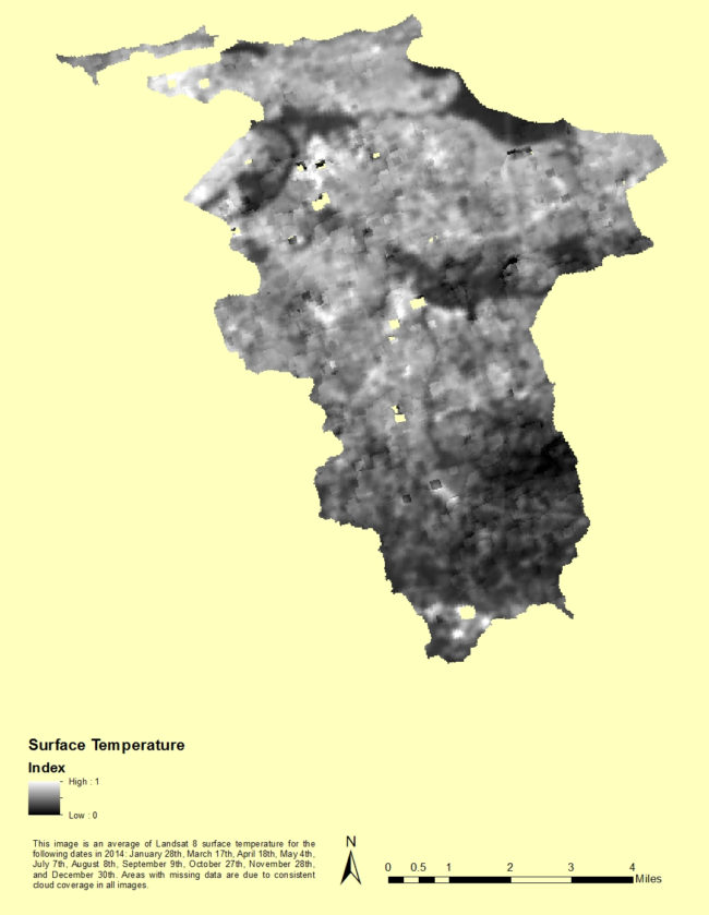 The San Juan Temperature Index Map indicates the normalized (between low (0) and high (1)) surface temperature scale.