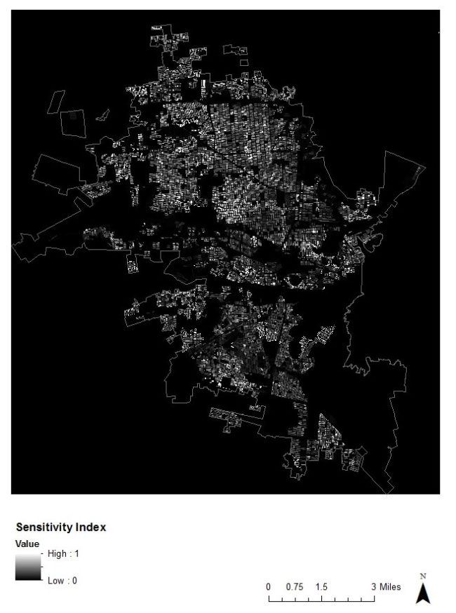 The Hermosillo Heat Sensitivity Index Map indicates the normalized (between low (0) and high (1)) spatial concentration of the population most sensitive to thermal extremes. In Hermosillo those sensitive populations include: the population below the age of 5, the population 65 years old and above, houses without electricity, houses without tap water, houses with at least 1 vehicle, adults 15 years old and above who are illiterate, the population without health service, the unemployed population, and the disabled population.