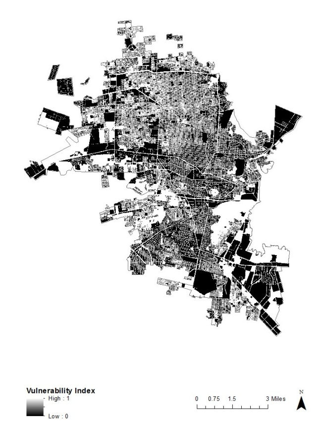 The Hermosillo Heat Vulnerability Index Map indicates the normalized (between low (0) and high (1)) spatial concentration of the population most vulnerable to thermal extremes based on their expected Sensitivity as well as their residence in relation to Exposure.